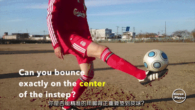 用脚背靠上的位置触到皮球,会让球变得很难控制。如果你是初学者建议大家不要太早停止这样的弹地颠球而开始正常的颠球练习。