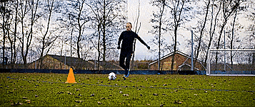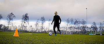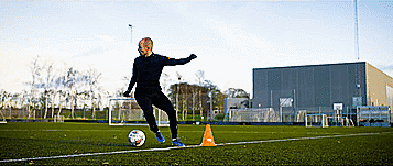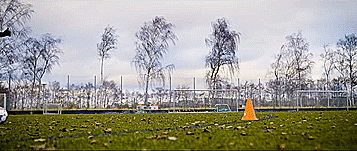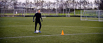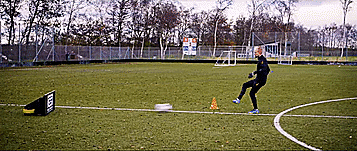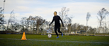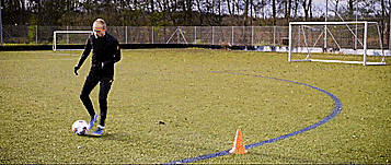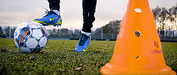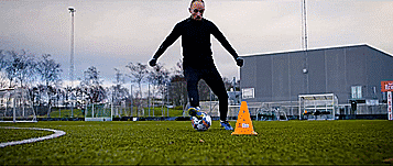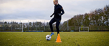 以下是一个练习踩单车的思路,把球推向标志盘或人体模型,然后练习把我们的脚落向一侧,肩膀下沉,然后向相反的方向加速。