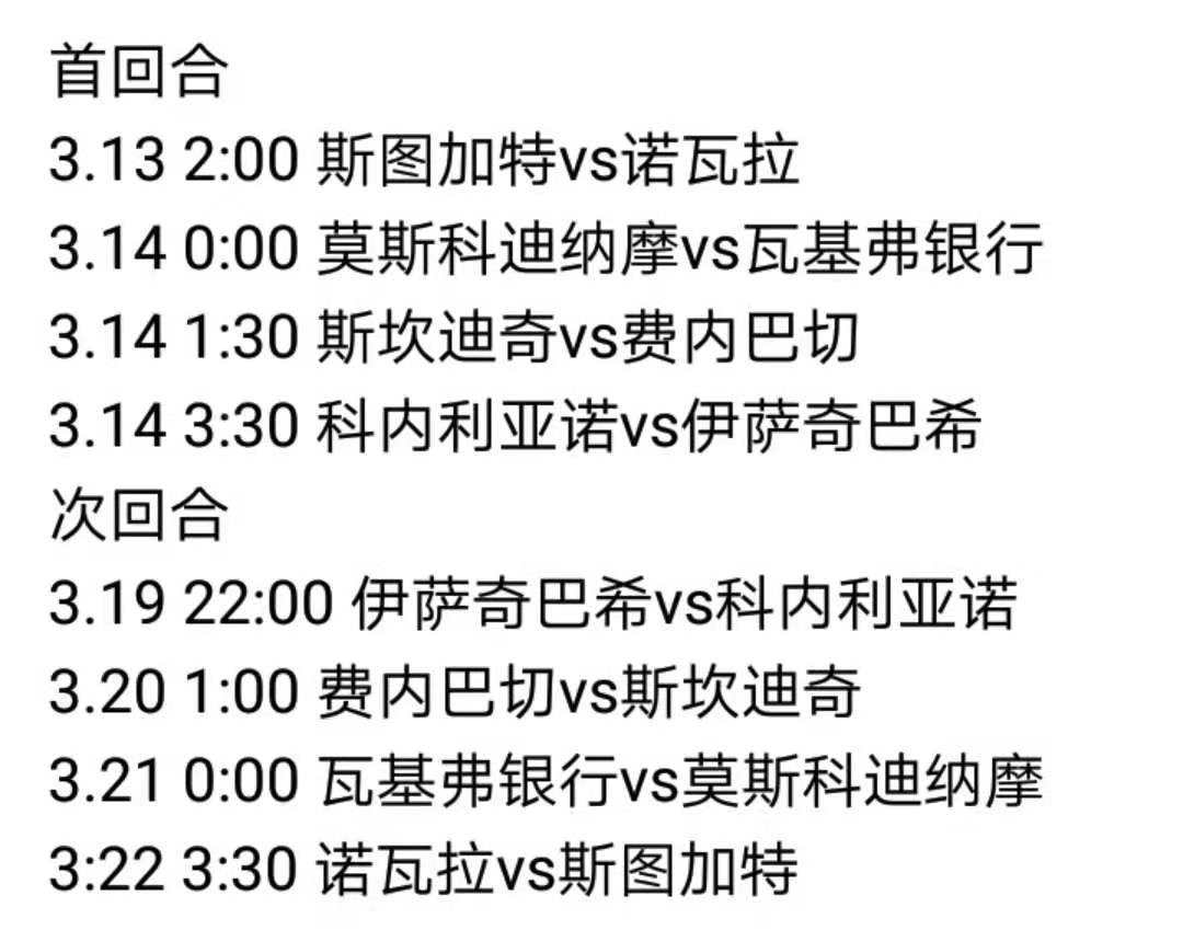 另外一个半区两场四分之一决赛分别是由土耳其联赛两支豪门对阵意大利女排联赛两支强队,费内巴切迎战斯坎迪奇的两场四分之一时间分别是北京时间3月14日凌晨1:30分和3月20日凌晨1:00。而欧冠最大夺冠热门伊萨奇巴希对阵科内利亚诺的比赛时间是3月15日凌晨3:00点以及3月19日晚间22:00点。