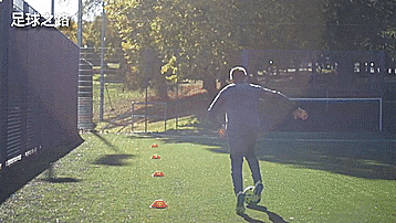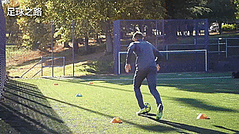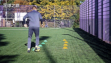 我们带球朝向中间的标志盘,进行一个二过一配合,然后第一脚触球向要去的方向,紧接着带球转身,所以带球的时候我们要控制好球,这样会更有效,还有一点很重要,那就是两只脚都要练,每一个方向左右脚都要用,训练60秒,休息一下,重复三组。