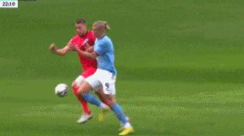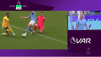 有德布劳内传球,哈兰德总能制造威胁。第19分钟,德布劳内横传门前,哈兰德插上,布莱顿门将罗伯特-桑切斯出脚拦截,哈兰德倒地!VAR介入,认为没有点球。