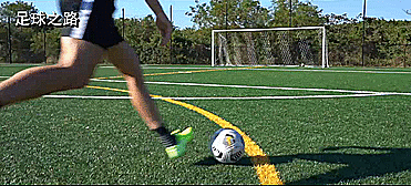 第一个是外脚背射门,外脚背射门有一点我们要记住,这一点非常非常重要,我们要直线接近球,而不是像我们平常射门一样从侧面接近。