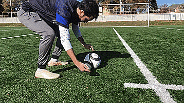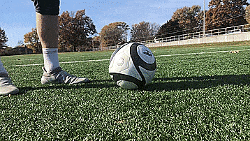 对于一个外脚背射门来说,如果我们使用右脚,我们将球的左下角开始试着向上切。