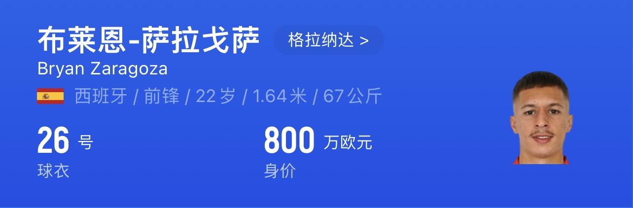 来到西甲联赛的萨拉戈萨没有怯场的,主场VS巴萨他的梅开二度 令人印象极其深刻,也令哈维的队伍毫无对策。迄今为止已经在14次出战的比赛中贡献了5个进球和2次助攻 ,是队内的头号射手。格拉纳达的全部破门几乎都有他的助力,主帅对他的信赖上升到了前所未有的级别。