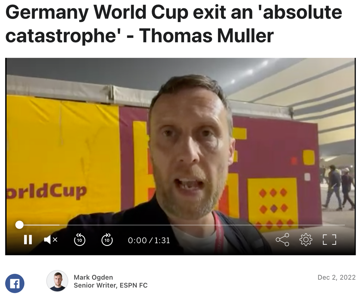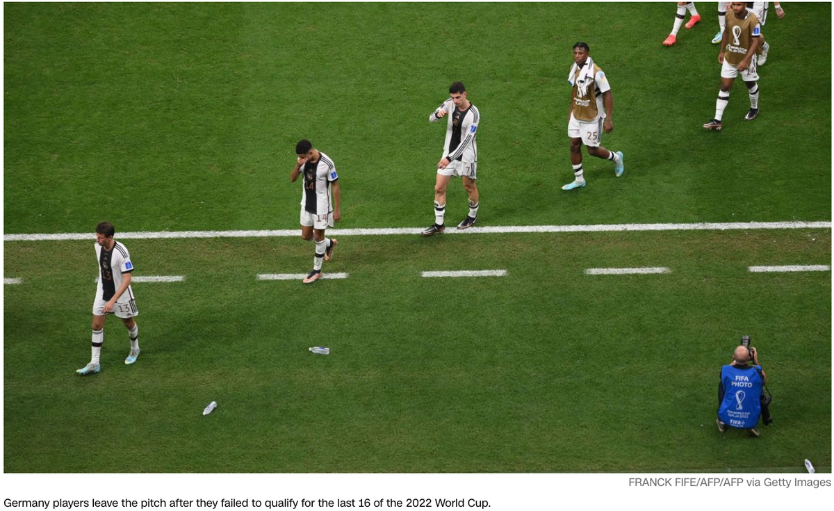回顾三场小组赛,德国队总体而言似乎踢得还不差。很多德国球迷在复盘后认为,真正的问题出在首战对日本队的第二个失球上,德国队防线出现明显失误,如果没有此球,德国队本该出线。不少人觉得,首战赛前德国队的捂嘴行动(在合影环节集体捂嘴,以此批评国际足联),分散了球队的注意力,进而导致比赛失利。社交媒体上于是出现了一波对德国队捂嘴照片的恶搞。