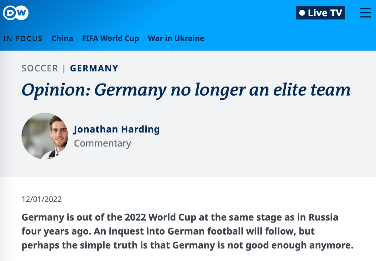 “德国之声”倒是也不护犊子,直接发了篇评论,说德国队已经不再是一支精英队伍了。