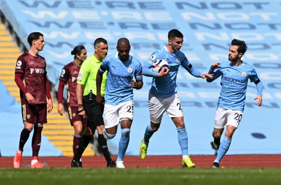 第18分钟,曼城右路打出配合,贝尔纳多-席尔瓦后脚跟妙传,马赫雷斯横向带球左脚弧线球射门被阿什拉夫头球顶出底线。