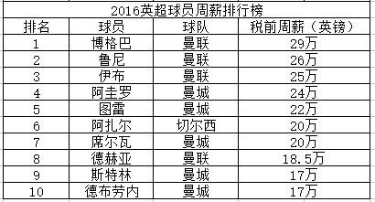 北京时间12月9日,《每日邮报》公布了英超球员周薪排行榜,排在前十位的球员有1名来自切尔西,4名来自曼联,5名来自曼城。其中博格巴以29万的税前周薪高居榜首,鲁尼伊布分别以26万和25万位列2到3位,随后排在4-10位的球员有5名来自曼城。“曼氏双雄”的财力可见一斑。