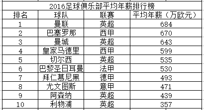 在2016足球俱乐部平均年薪排行榜中,曼联以684万欧元的平均年薪名列第一,随后是巴萨的670万欧元以及曼城的643万欧元。而在前十的俱乐部中,有5支来自英超,今年夏天英超的各种大手笔买卖果然不是空虚来风。