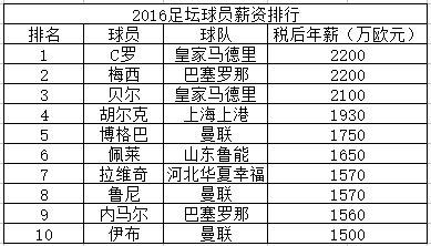 2016足坛球员薪资排行