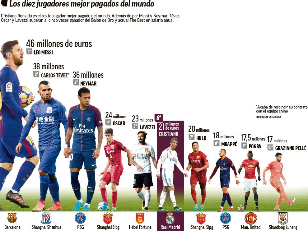 C罗同梅西的薪水差距究竟有多大?日前《马卡报》列出了世界足坛薪水最高的10名球员,在这份榜单中C罗2100万欧元年薪仅仅排在第6,甚至还不到梅西的一半。