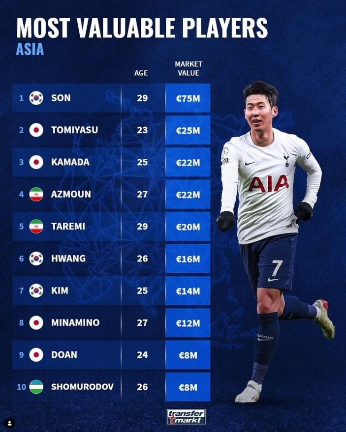 直播吧6月26日讯 德转盘点亚洲球员身价榜,热刺边锋孙兴慜以7500万欧的身价一骑绝尘排在首位,这位韩国球星比第二名的阿森纳后卫富安健洋高出5000万欧。
