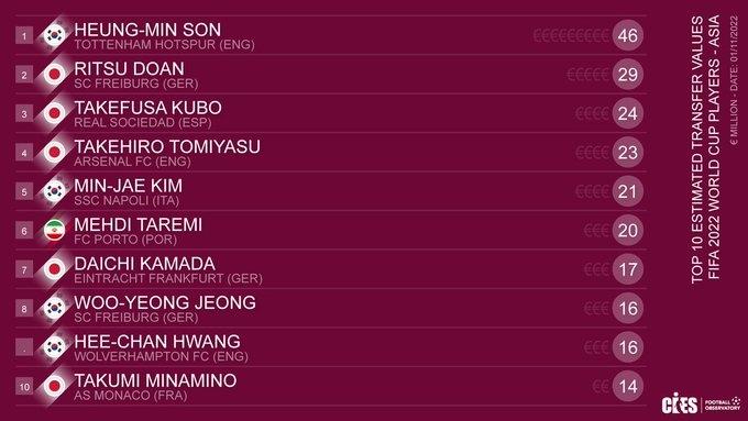 直播吧11月19日讯 CIES(瑞士足球天文台)评估了参加本届世界杯的亚洲球员转会价值,并列出榜单,孙兴慜以4600万欧居首,前10日本占5人,韩国占4人。