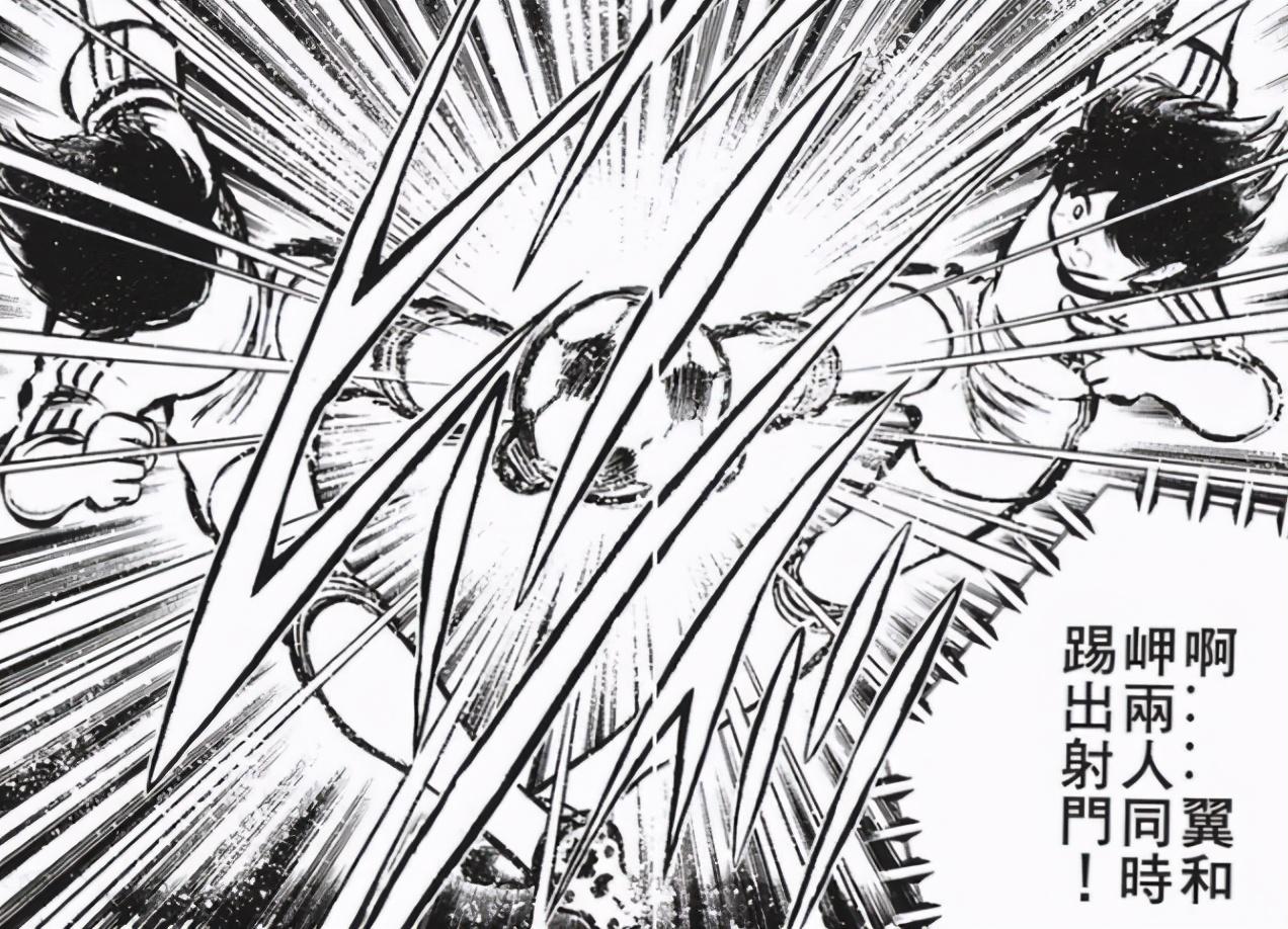 于是在《足球小将》的故事中出现了无数个“杀人球技”的大招。比如:剃刀射门、高空飓风、猛虎劲射、三角射门、火焰劲射等等。以至于早期大空翼和岬太郎的双人射门已经成为“平平无奇”的射球。