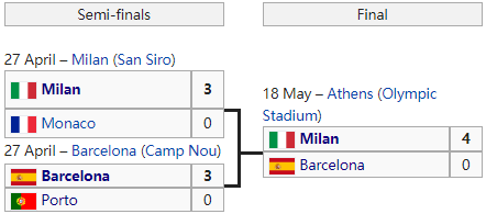 93/94赛季,则是42支球队进行1轮附加赛(20进10)和2轮淘汰赛(32进16、16进8),产生最终参加小组赛的8支球队。8支球队分为两组,每组前两名晋级半决赛。最终米兰击败巴萨夺冠。