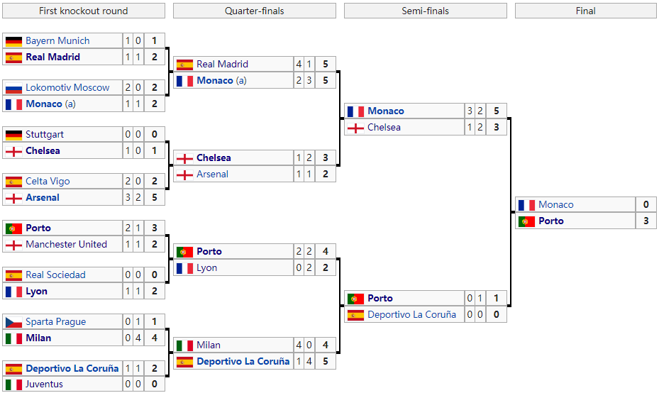 这是一次堪称史上最冷的欧冠,最终晋级四强的是穆里尼奥执教的波尔图、德尚执教的摩纳哥,拉涅利执教的切尔西和伊鲁雷塔执教的拉科,最终穆里尼奥和波尔图成为了赢家。