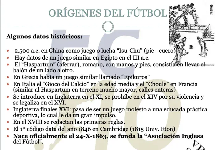 课本里面提到足球起源于2500年前的战国时期,在中国叫蹴鞠。国际足球联合会在2004年确认足球起源于中国山东。蹴鞠始于战国时代,在唐朝开行。有数据显示在埃及公元前世纪也有出现过类似的游戏。罗马人当时也玩一种游戏,是手脚并用,把球从一边传到另一边。在希腊也有类似的游戏叫”埃皮库罗斯”。 在意大利中世纪类似的游戏叫乔科德尔卡尔西奥”和在法国叫”乔勒”。 足球在11世引入英国,在第14世纪因暴力而被禁止,并在16世纪合法化。在18世纪开始起草足球的规则。最后英国足协在1863年成立,才有了现代足球的雏形。