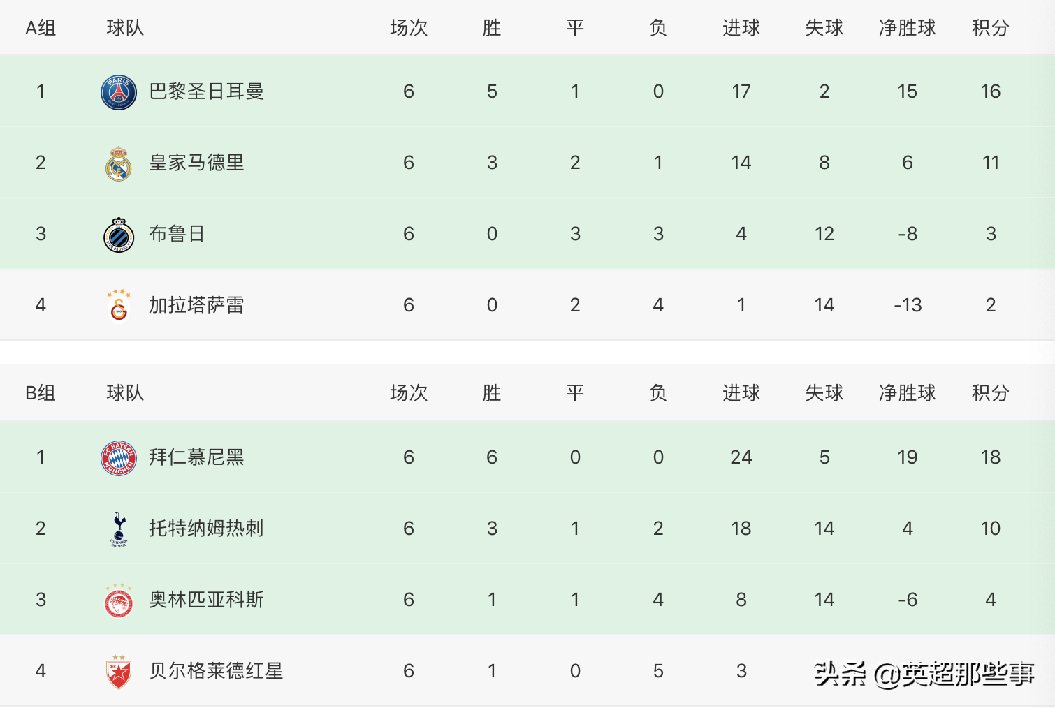 A组中,大巴黎一骑绝尘早早出线,小组赛取得5胜1平相当强势,皇马积11分,这已经是他们在近二十年来,小组赛中积分较少的一次了,一场未胜的布鲁日积3分拿到了一个欧联杯资格。B组中,同样是2强2弱的局面,拜仁6战全胜轰进24球,早早拿到出线权,热刺在前2战积1分的情况下,依靠一波3连胜提前一轮获得出线权。