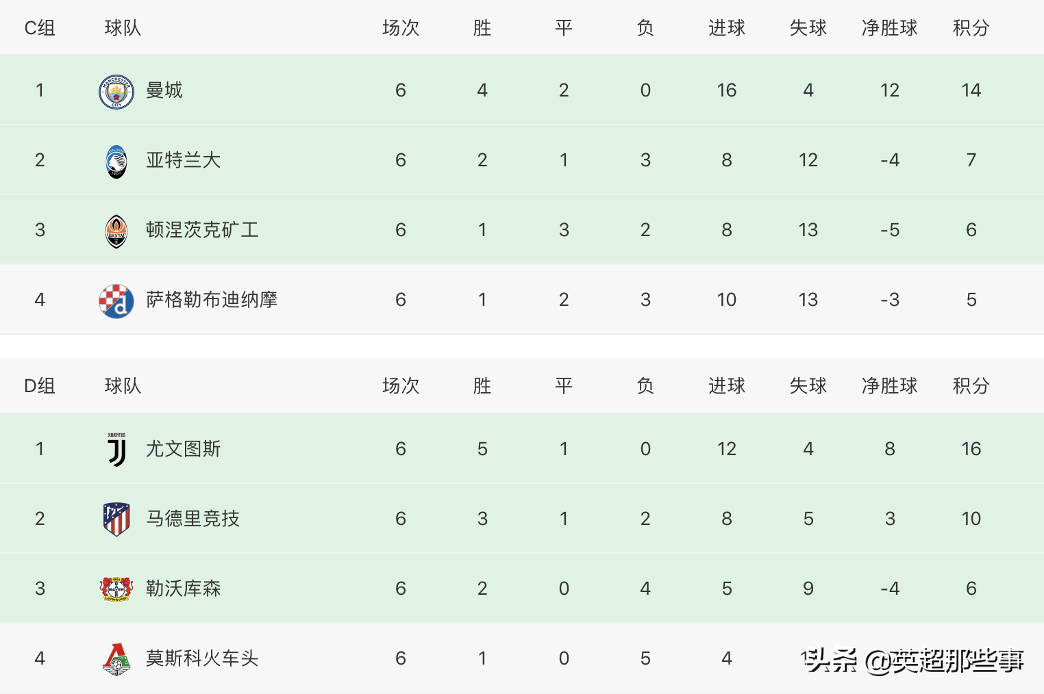 C组中,曼城实力强大提前一轮锁定小组第一,亚特兰大和顿涅茨克矿工、萨格勒布迪纳摩纠缠到最后1轮,最后成功逆袭晋级,成为欧冠改制来首支3连败开局还能出线的球队,这主要得益于1强3弱的小组格局。D组中,尤文图斯和马竞出线,勒沃库森在前3战全败的情况下,还能将悬念保留到最后一轮,已经十分了不起了。