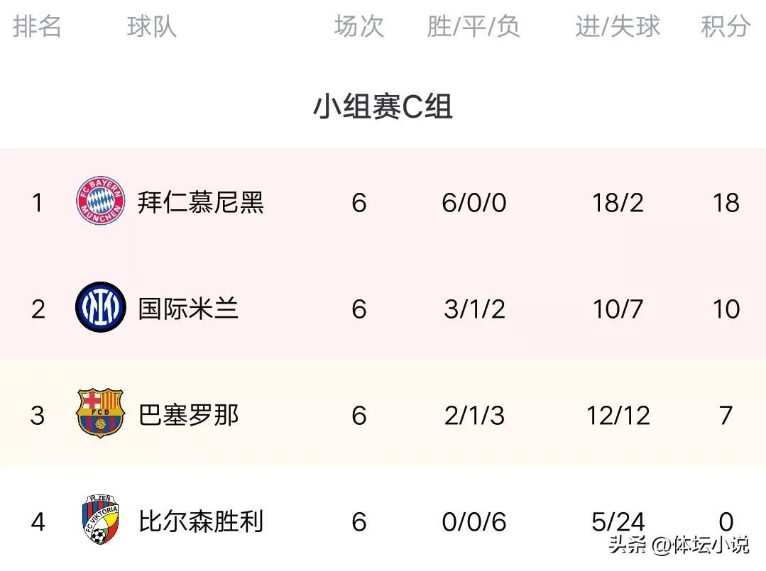 C组末轮结束了两场比赛,已经提前拿到欧冠的拜仁和国际米兰进行比赛,本场比赛没有任何意义,结果拜仁延续了连胜势头,2-0完胜国米,强势轰出6连胜,是本届欧冠小组赛唯一一支6连胜的球队,攻守兼备真的是太强了。而巴萨面对垫底的比尔森胜利,最终以4-2的比分笑到了最后,成功拿到小组第三,杀进欧联杯,本组最终排名拜仁第一,国米第二,巴萨第三,比尔森胜利垫底!