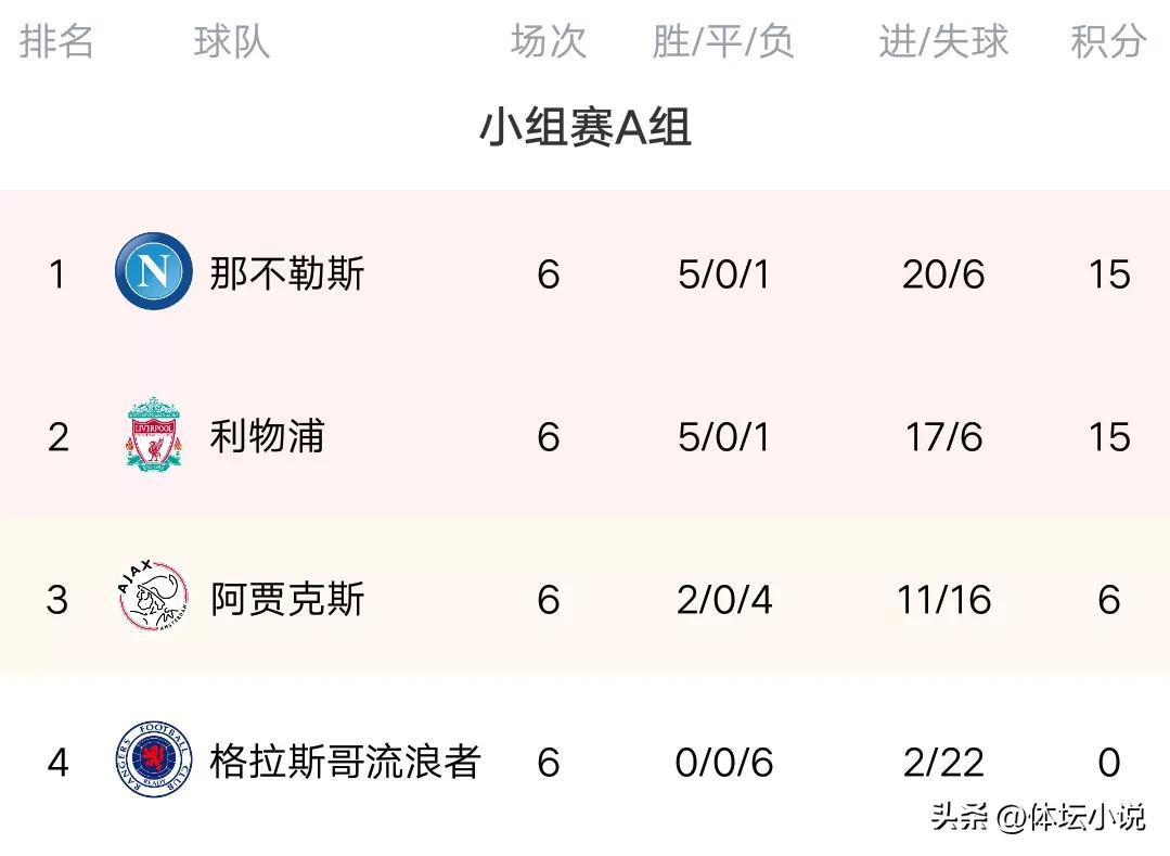 A组末轮结束了两场比赛,已经提前出线的那不勒斯和利物浦上演了强强对话,结果那不勒斯战意不佳,利物浦依靠萨拉赫和努涅斯的进球,利物浦2球主场完胜那不勒斯,拿到5连胜,同时送给那不勒斯欧冠首败。另外一场比赛阿贾克斯和垫底的流浪者争夺欧联席位,结果阿贾克斯火力全开轰出3-1击败了对手,这样一来A组的排名确定,那不勒斯以净胜球优势力压利物浦排名第一,两队携手杀进欧冠,阿贾克斯第三晋级欧联,流浪者垫底出局!