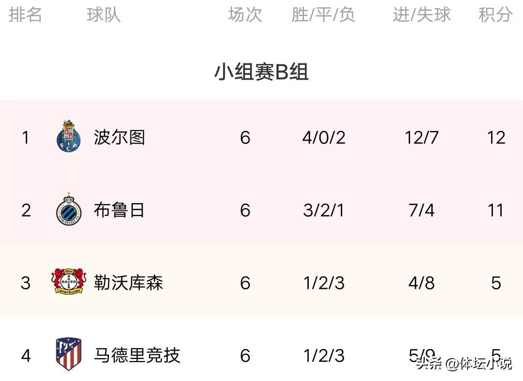 B组末轮结束了两场比赛,波尔图2-1击败了马竞,从开局两连败到强势收获4连胜,波尔图锁定第一,而勒沃库森0-0与布鲁日握手言和,这样一来本组最终波尔图拿到了小组第一,布鲁日第二,勒沃库森第三晋级欧联,马竞垫底出局,说实话这个小组踢成这样出乎很多人的意料,尤其是马竞真的太惨了,欧联都没得踢,真的是没落了!