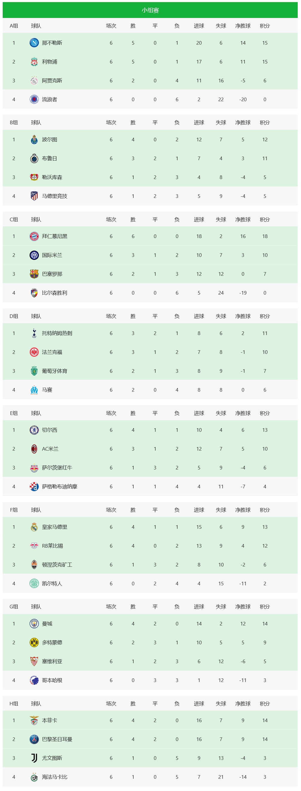 小组第一:那不勒斯、波尔图、拜仁、热刺、切尔西、皇马、曼城、本菲卡