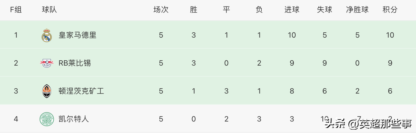 F组中,莱比锡主场3-2击败皇马,3分优势力压矿工,末轮客战矿工只要不败,就能出线,皇马遭到了本赛季首败,不过仍然占据争夺小组第一的主动权;顿涅茨克矿工客场1-1战平凯尔特人,落后莱比锡3分,末轮将在主场死磕莱比锡,赢球才能出线。