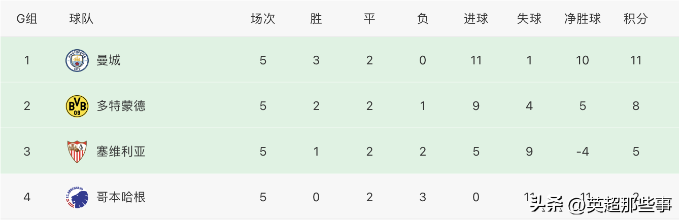 G组中,多特蒙德主场0-0战平曼城,领先塞维利亚3分,并且相互战绩占优,提前一轮锁定小组第2,获得出线权;塞维利亚主场3-0完胜哥本哈根,取得欧冠首胜,将出战欧联杯,哥本哈根确定垫底出局。