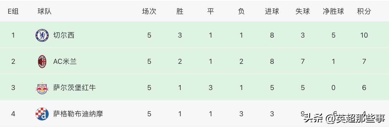 E组中,切尔西客场2-1击败萨尔茨堡红牛,取得3连胜,提前一轮出线,科瓦西奇和哈弗茨分别破门,萨尔茨堡遭到首败,仍旧保留出线希望;AC米兰客场4-0大胜萨格勒布迪纳摩,升至积分榜第2位,下轮回到主场只要不输给萨尔茨堡红牛,就将小组出线。