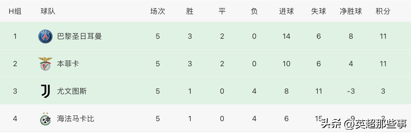 巴黎客场2比1击败尤文,他们要争夺小组第一,必须拿到三分,姆巴佩先进一球,博努奇扳平比分,第69分钟,门德斯进球,巴黎拿到三分,但还是排名小组第二。同组的本菲卡客场6比1大胜海法马卡比,本菲卡和巴黎的胜负关系相同,进球数和丢球数相同,只能比较客场进球数,本菲卡达到9个,力压巴黎的6个,拿到小组第一。