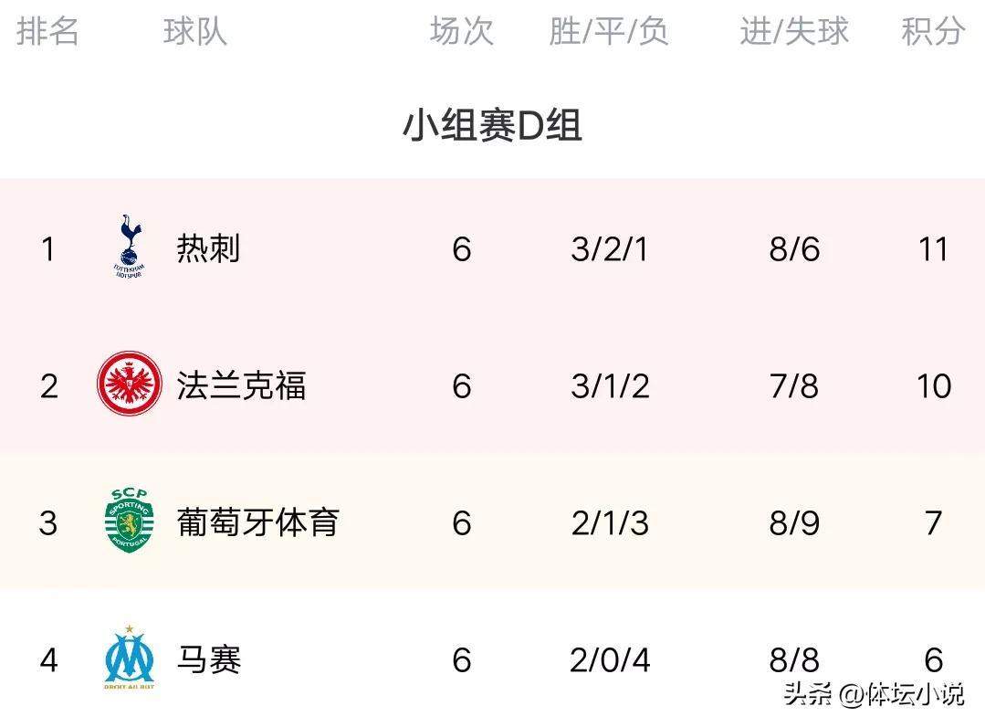 D组末轮结束了两场比赛,本组堪称死亡小组,直到末轮4队都有出线机会,结果热刺在先丢一球的情况下,依靠霍伊别尔的进球2-1读秒绝杀逆转马赛,不仅拿到了出现权,还抢到了小组第一,而法兰克福同样也是先丢一球,依靠镰田大地和穆阿尼的进球2-1逆转葡萄牙体育,拿到了小组第二,这样一来热刺和法兰克福拿到了出线权,最终排名热刺锁定第一,法兰克福第二,葡萄牙继续第三,马赛垫底出局!