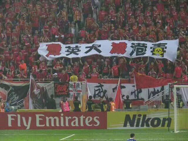 在恒大客场击败东方的比赛中,恒大球迷在比赛尾声举出了带有政治成份的横幅。