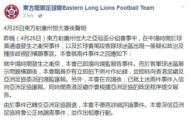 赛后,香港东方体育会通过官方渠道发表声明,表示已经对此事向亚足联汇报。今天亚足联官方对广州恒大俱乐部提出了指控,据悉恒大有可能遭遇罚款或者空场的处罚,但亚足联官方并未在指控中表明具体的处罚措施。但是根据亚足联第58条《歧视》的有关规定,有歧视行为的球迷所支持的俱乐部将受到至少15000美元的罚款以及至少2场比赛禁止球迷观赛的处罚,球迷至少2年禁止进入体育场。第65条规定:客队俱乐部需要对本队的球迷行为负责,除非可以证明不当行为并非由本队球迷实施。