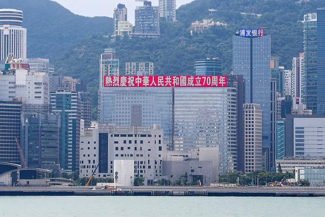 恒大香港总部大楼位于港岛核心区域,其顶楼的LED屏高10米、长110米,是香港最大、最长的巨幅LED屏。早在8月开始,恒大利用总部大楼LED屏,展示出一排五星红旗在维港上空迎风飘扬。今天开始,五星红旗与庆祝国庆标语交替出现,成为维港天际线最绚丽夺目的一道风景。