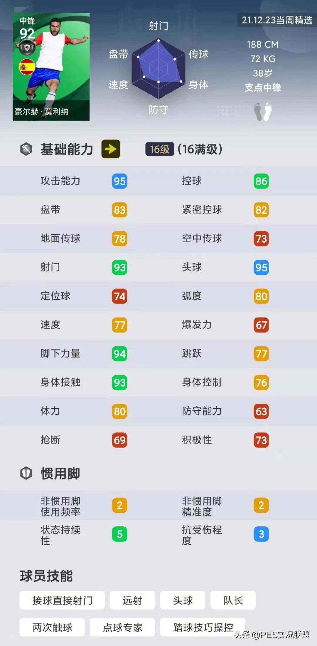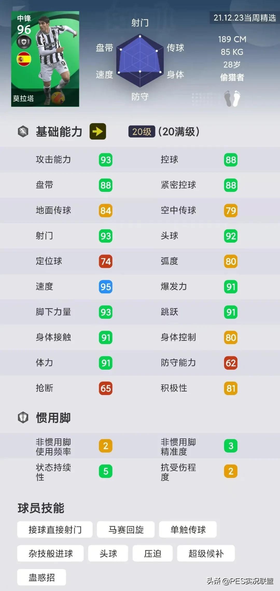 球员简析:莫拉塔(精)除了风格和速度,其它绝大部分属性都相当于是低配的普卡C罗。但他自带了超级候补技能,替补出场时所获得的能力加成非常可观。