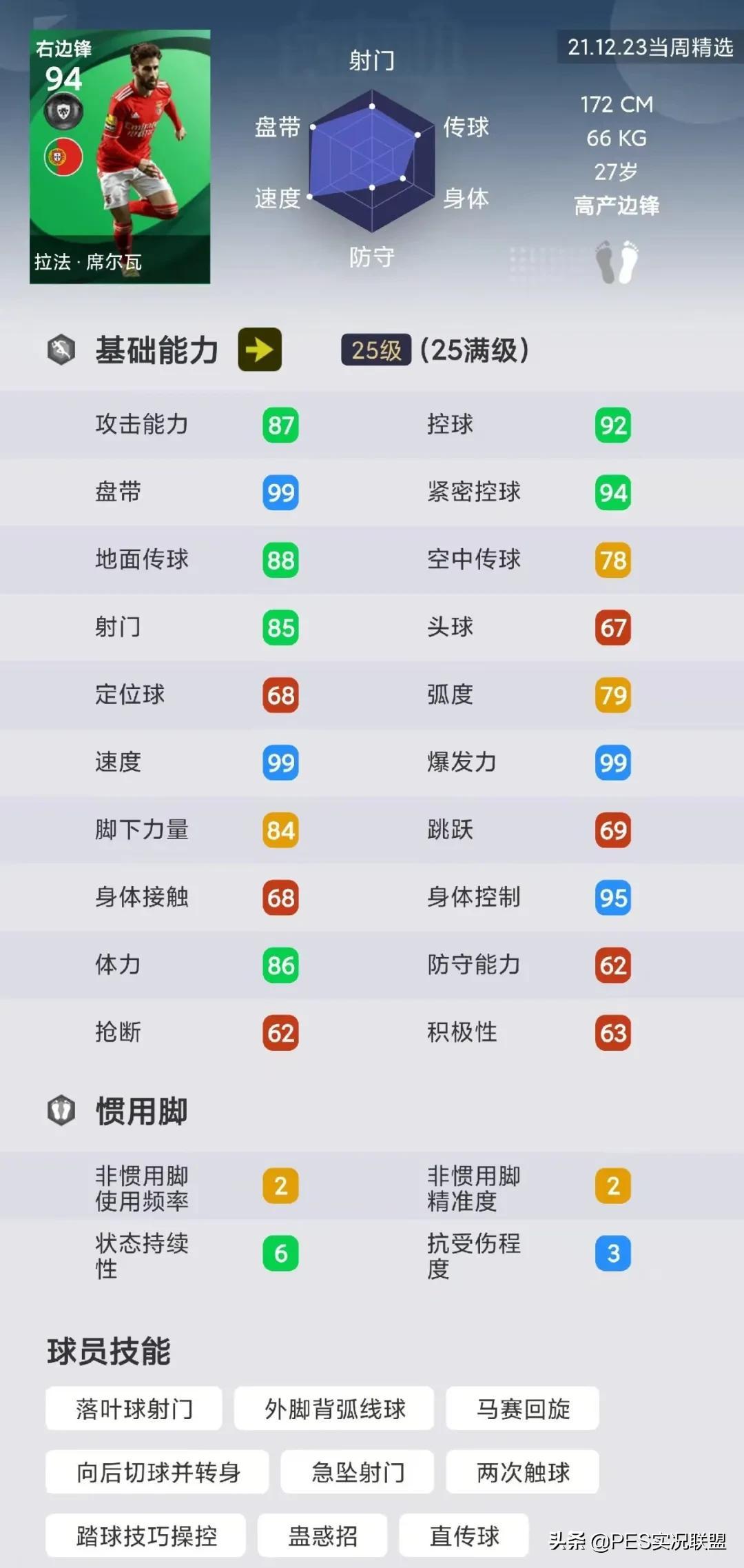 球员简析:拉法·席尔瓦的精选很有特点,满级双速和盘带都是99,并且兼具95的身体控制,可以说是天然的边路爆点。但他的缺点也很明显,即模型小、对抗差,实际带球速度和面对防守球员贴身逼抢的时能力不强,故整体实力与准毕业球员尚有一定差距。