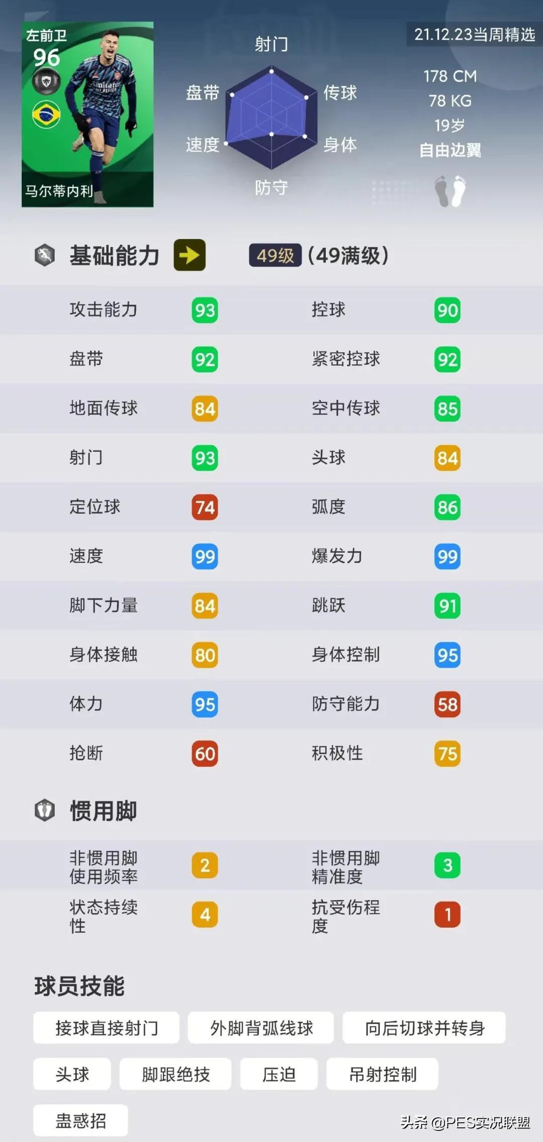 球员简析:马尔蒂内利(精)是一个优缺点都很明显的球员,其优势是拥有满级99的双速,并且兼具95的平衡和体力;但缺点是状态持续性偏低,且身体对抗能力不强。