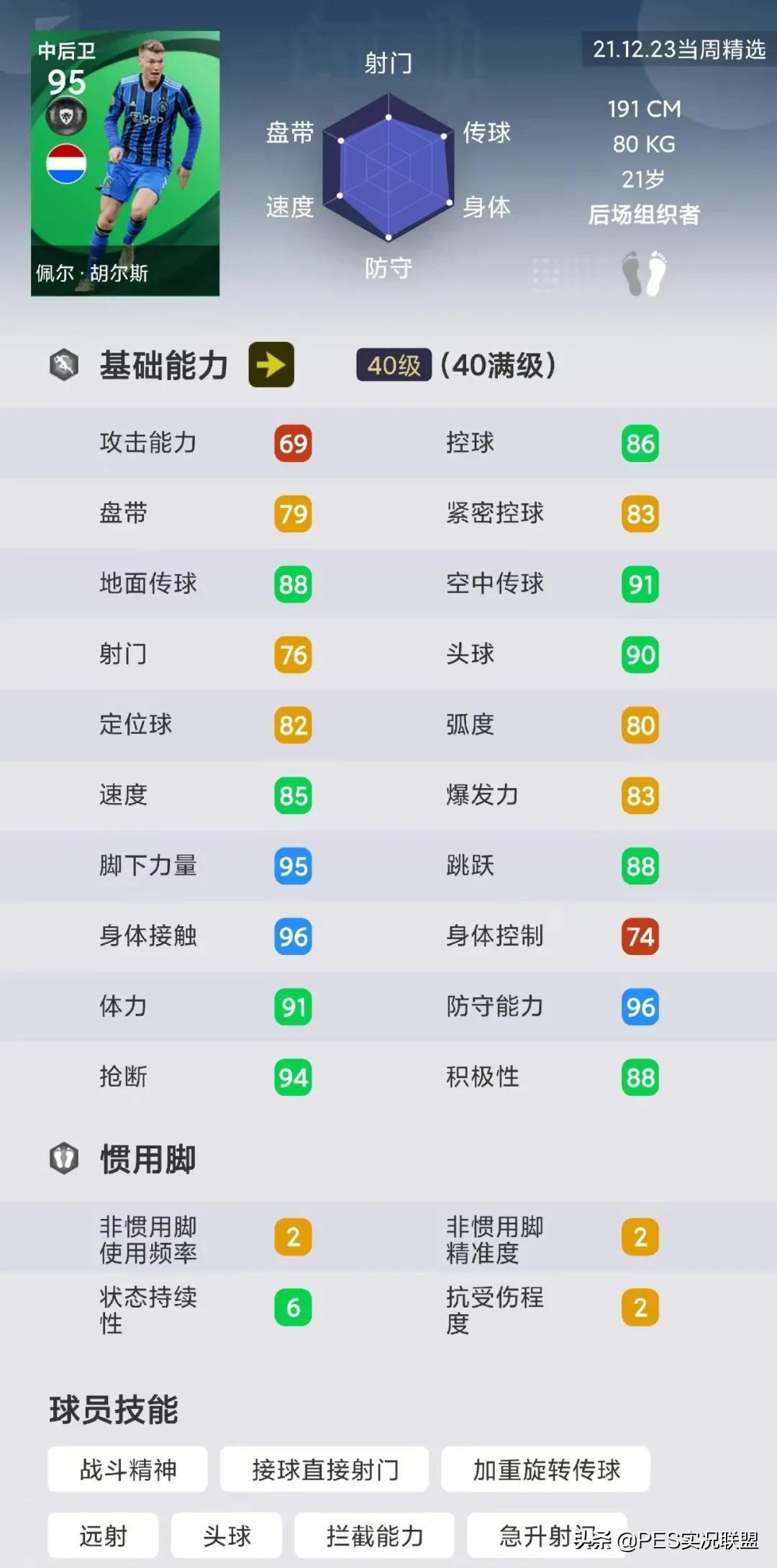 球员简析:埃尔马斯(精)是一个攻强守弱的B2B中场,对抗和双防能力偏低,防守积极性也不是很高,因此并非游戏所青睐的球员类型。