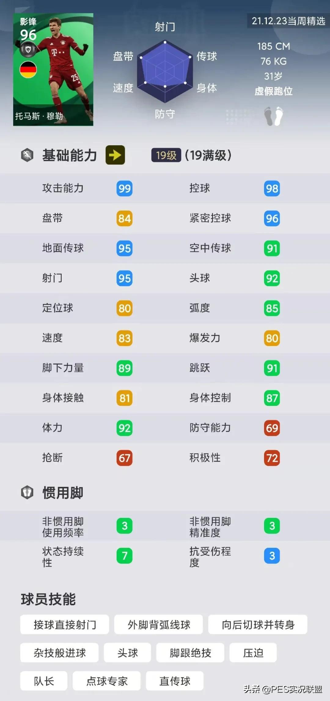 球员简析:虚假跑位这个风格的主要作用是为其他创造空挡,在游戏中的跑位比较迷惑,时而前插时而回撤,控制球员的玩家和对手一样无法预估他接下来的跑动路线,这就导致游戏中层出不穷的精选穆勒,从未成为过热门球员。但对于德国和拜仁队套玩家来说,穆勒(精)肯定是必入球员。