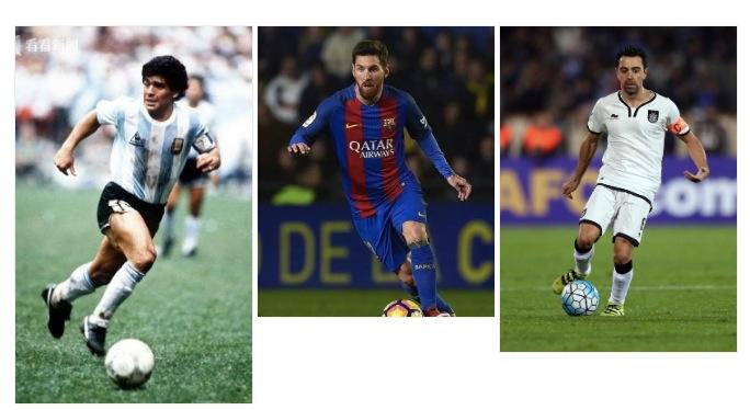 从左至右依次是:球王马拉多纳 阿根廷队的梅西 西班牙队的哈维