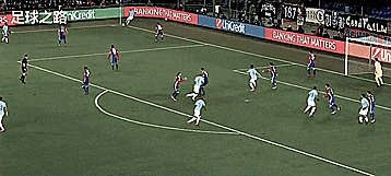 我们瞄准六码区附近,然后击打球的底部形成回旋,将球搓向禁区。
