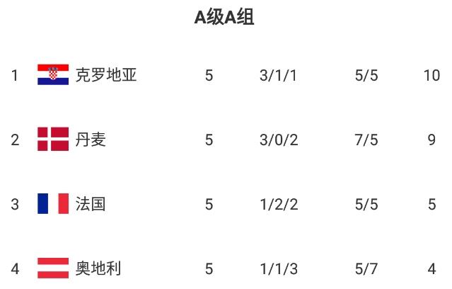 本组积分榜中,克罗地亚10分升至第一,丹麦退至第二,法国5分升至第三,奥地利垫底。