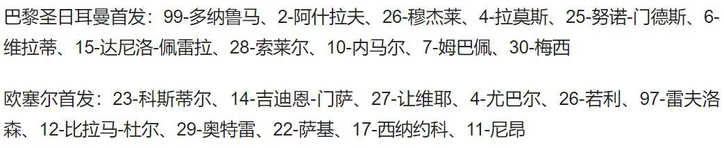 巴黎首发:99-多纳鲁马、5-马尔基尼奥斯、4-拉莫斯、15-达尼洛-佩雷拉、33-扎伊尔-埃梅里、6-维拉蒂、8-法比安-鲁伊斯(79' 18-桑谢斯)、14-贝尔纳特、30-梅西、44-埃基蒂克(55' 17-维蒂尼亚)、7-姆巴佩