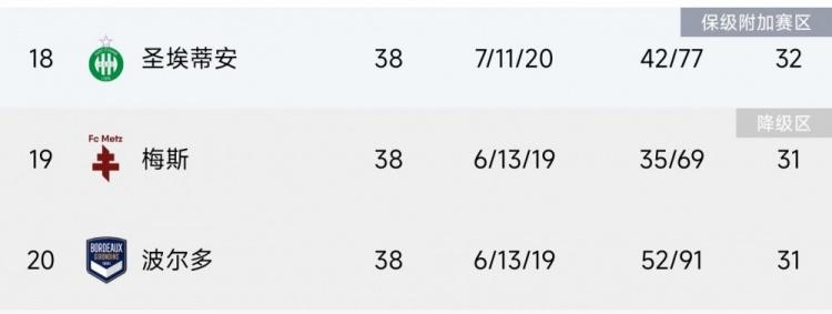 直播吧5月22日讯 21-22赛季法甲收官,圣埃蒂安1-1战平南特,但梅斯0-5不敌巴黎圣日耳曼,圣埃蒂安以1分的优势挤进保级附加赛区。