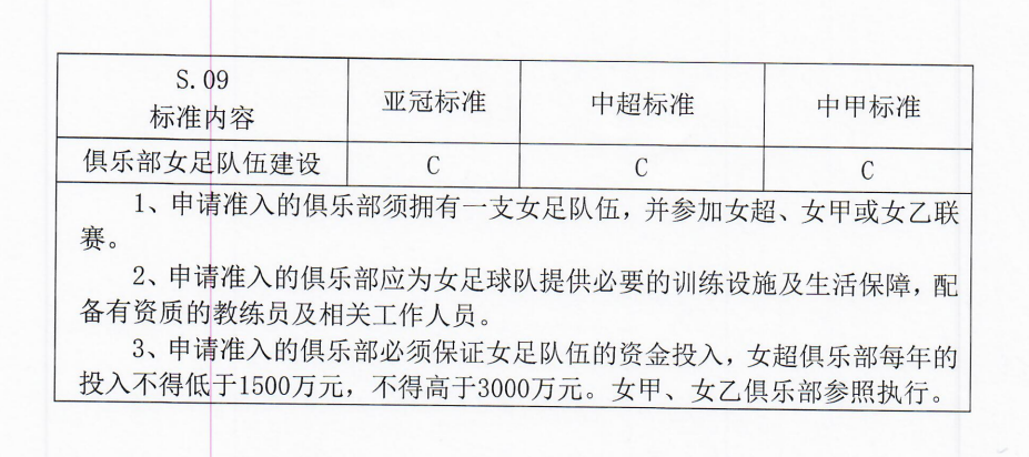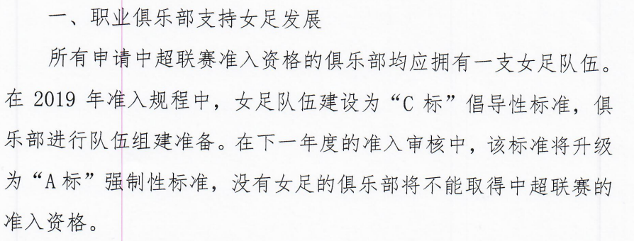 中国足球协会在2019年“金元足球”末期发布的《关于增加和调整部分内容的通知》(足球字[2019]2号)明确规定,申请准入的俱乐部必须拥有一支女足队伍,自2020年起更是“没有女足的俱乐部将不能取得中超联赛的准入资格”,而其对女超联赛俱乐部每年的投资不得少于1500万元: