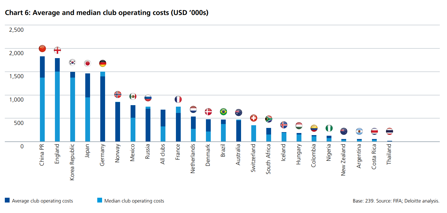 以中国女足为例,在国际足联于2021年发布的《国际足联基准报告:女子足球》(第一版)中,中国女子足球俱乐部当时的年平均运营支出高居世界第一,高达180万美元左右: