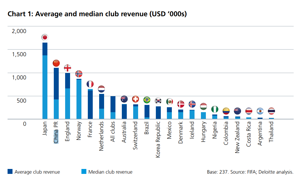 虽然中国女子足球俱乐部的收入在世界范围内也算名列前茅,排名第二: