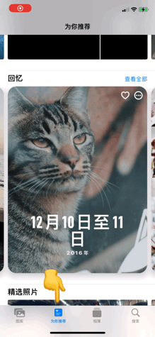 打开相册,选择「为你推荐」标签页,任意选择一个「回忆」,可以看到由系统即兴生成的动态交互效果,伴随着音乐节拍进行切换。