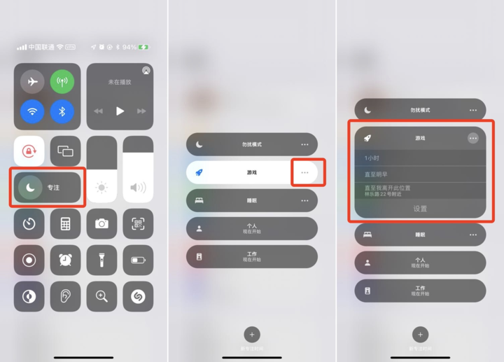 智能激活:在「设置 > 专注」中可选择此项,将根据定位、app 使用情况等信号适时自动打开对应状态的「专注模式」;手动打开:从屏幕右上方边缘向下轻扫打开「控制中心」,点击「专注模式」即可。▲手动开启「专注模式」